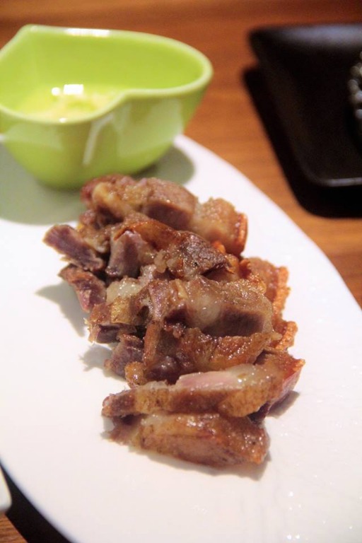 2.現成鹹豬肉放進烤箱加熟。190度:15分鐘。烘烤時,可準備沾醬:白醋加蒜末。
