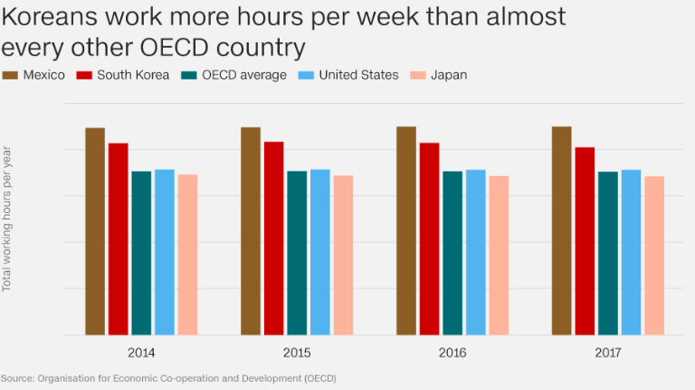 根據政府數據,他是2017年因工作過度而死亡的數百人之一。在OECD國家中,韓國人平均每週工作時間比其他所有國家都要多,而且比著名的勤勞德國人高出50%。