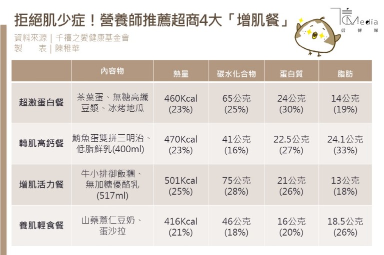 「且要選擇並攝取足量的優質蛋白質,如豆、魚、蛋、肉、奶類,才能有助肌肉合成,一般飲食可以選擇蛋類、魚肉、雞肉...這些食物消化吸收的速率,相較於牛肉、豬肉來說是比較快的。」高繪雯也推薦超商4大「增肌餐」給民眾參考: