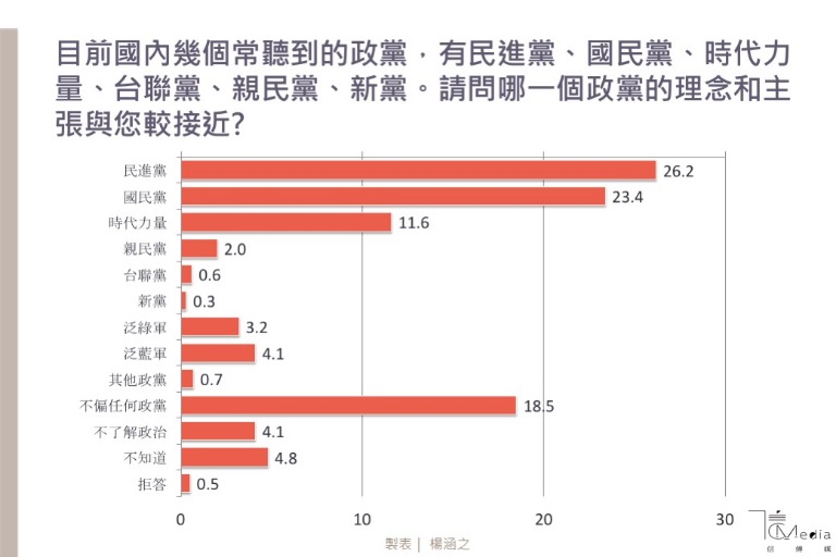 詢問抽樣受訪者的政黨傾向,26.2%自認較接近民進黨,傾向國民黨的有23.4%,偏向時代力量有11.6%,至於不表態與不知道的「中間選民」,約有27.4%,與前一次民調相比,國民黨認同度是27.5%,民進黨認同度24.1%,這次民進黨超越了國民黨,顯示綠營的危機總動員已讓「隱性」民進黨認同者較願意表態了。