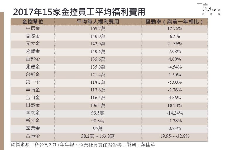 攤開15家金控的2017年年報及企業社會責任報告書,並列出各家非主管職員工平均福利費用之排行,其中,中信金控非主管職員工平均每人福利費用(含薪資,以下同)高達169.7萬元,拿下金控之冠,且與2016年相比,成長率也呈現雙位數,來到12.76%。