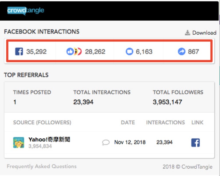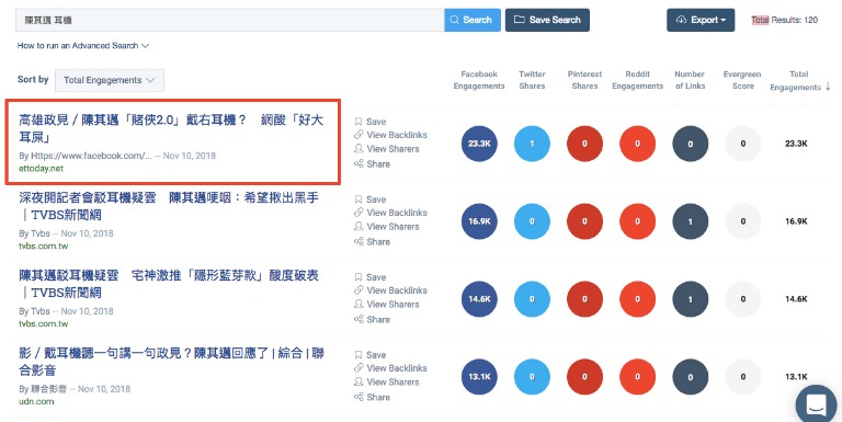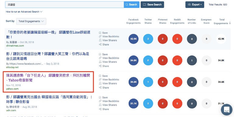 其中像是「陳其邁造勢『台下狂走人』 邱議瑩哭腔求:拜託別離開」就是互動程度相當高的新聞之一,一共有34.6K,若再拿這則新聞到Google擴充工具「CrowdTangle Link Checker」查看在社群網站上的表現效果,會發現光是在臉書上的按讚(或表情)數就有高達2萬8千多個,留言回應多達6千多則,更是有近900個轉貼分享數。