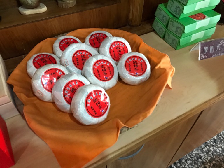 「酸柑茶」是什麼呢?它是台灣客家人運用古法製作的一種果茶,其口感相當甘甜,且具有潤喉、預防感冒的效果,是目前客家庄相當知名的伴手禮,家家戶戶都仍會製作這一種茶品。其製作的方法主要是將當地製茶過程中所殘餘的茶末,以及祭拜時所剩餘的虎頭柑作為原料,將其回收再利用,把虎頭柑內部的果肉挖出並與茶末混合攪拌均勻,再塞回這些已挖空的果實之中,並用綑綁、壓扁、烘蒸、曬乾等「九蒸九曬」的步驟緊壓,讓其成為一塊塊的圓餅狀的茶磚,整個製作過程需歷時半年。