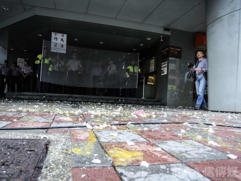 今日抗爭留下滿地空服員怒擲的破碎雞蛋,也留下台灣勞工史上最黑暗的一頁。(攝影/蕭芃凱)