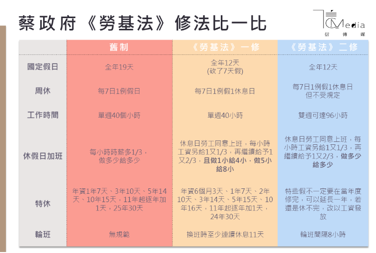 事實上,2016年《勞基法》第一次修法,當時從立法院院會一讀付委到三讀通過,總共花了近5個月的時間,不過因上路後問題重重,在勞資雙方都給壓力下,蔡政府短時間內就進行第二次的修法,而這次的時間更是火速,僅花不到2個月就完成修法,兩次的大刀闊斧,不是太偏向勞方,就是將勞基法推回原點,讓蔡政府在勞工這一塊大失選票。