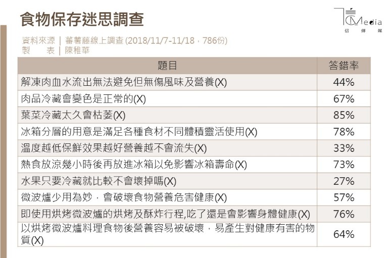 根據最新一份由蕃薯藤公佈的「食物保存迷思調查」顯示,國人食物保存觀念普遍不足,平均得分竟不到40分,更有近8成民眾對食物保存相關認知不及格。常見迷思包括: