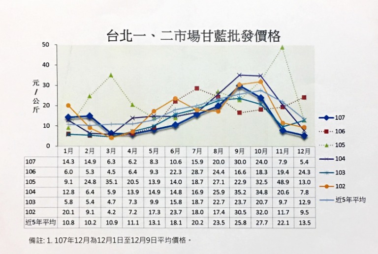 然而,翻開過去5年台北第一、二果菜市場的甘藍菜批發價格數據,會發現每逢入冬季節,高麗菜菜價就會下滑,「如果把105年拿掉,所有的走勢都是這樣,該下來就是會下來,8~10月(菜價)就是會比較高。」一位長期觀察地方農業生態的人士分析,台灣過去30年高麗菜菜價幾乎都呈現這個趨勢,「這時候問題來了,農民如果都知道這個走勢,那搶種高麗菜是什麼行為?」