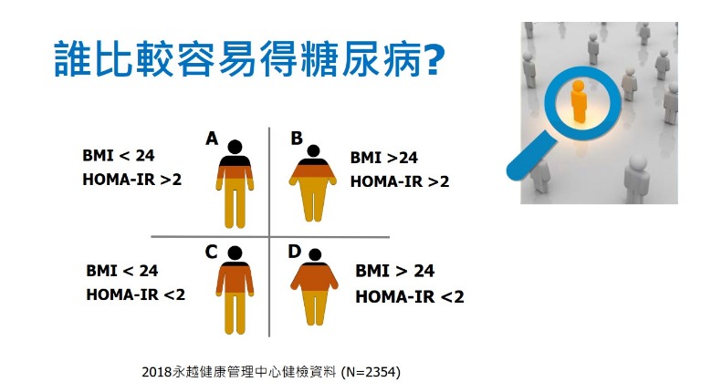 她進一步解釋,「胰島素阻抗」代表胰島素訊號不良,「一項華人健康的研究統計發現,胰島素阻抗指數1.4以上血糖就可能異常、超過2就屬於糖尿病,開始要提高警覺,其中也發現這些胰島素阻抗超過2的民眾,BMI指數都屬於過重,可以證明體重對糖尿病有絕對的影響。」