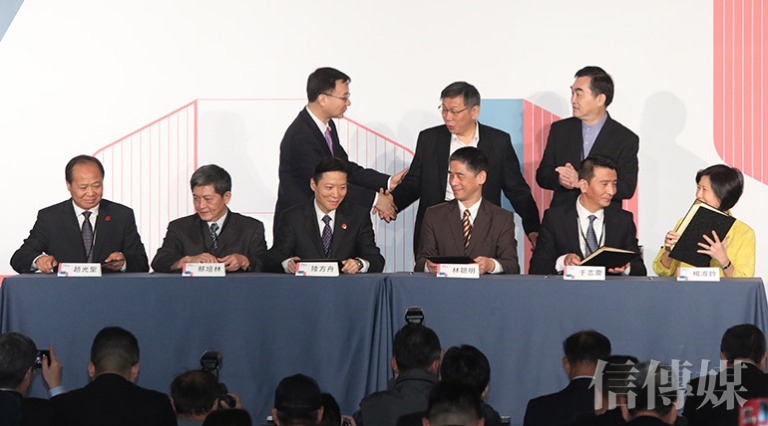 在柯文哲、周波及台北市副市長鄧家基共同見證下,兩岸代表簽署體育、電影、交流等3項合作備忘錄。