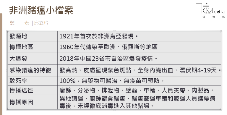 第三,儘管非洲豬瘟病毒目前停留在豬隻間傳染,尚未傳然給人類,中國官方常宣傳人類吃瘟疫豬肉無害,但人類會成為病毒的傳播途徑。即便病毒已經被發現長達97年,但目前還沒有藥物和疫苗,供給豬隻治療或防治,且各年齡、品種的豬隻都可能感染,難以倖免。