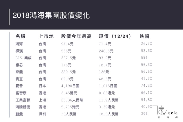 其實鴻海集團一直以來並不只有代工iPhone的業務,旗下軍團還包括面板、網通以及電子零組件代工公司,根據《信傳媒》統計,總共有近20間散布在中、港、台、日多地上市,股價均呈現下跌狀態,其中以日本夏普跌幅超過七成最大,香港的富智康跌幅超過六成,樺漢、業成、訊芯、京鼎以及今年上半年風光在上海A股掛牌的工業富聯(FII)跌幅都超過五成。