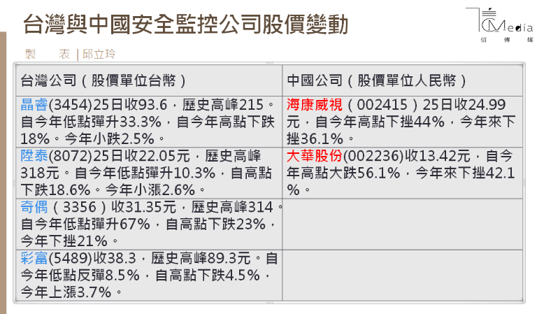 財金文化董事長謝金河去年12月就曾表示一家「海康威視」打趴台灣整個安全監控產業,安全監控產業原來是台灣小而美的利基型產業,曾經是市場上的飆股,但在中國大陸的海康威視崛起後,市場競爭壓力加劇,再加上認列匯損,導致奇偶、陞泰去年分別每股虧損1.98元和0.25元,競爭力最強的晶睿被台達電併購,這三家安控股的市值今年最慘時從歷史高峰下挫90%到50%。