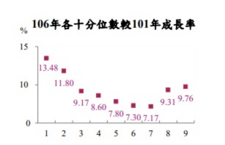 有趣的是,主計總處將2017年各十分位數與2012年相比,第1十分位數5年間增加13.48%、第9十分位數也增加9.76%,成長率曲線呈現「U」型趨勢,也就是說,位於高、低兩端的受僱員工薪資成長較快,其餘則相對較緩。
