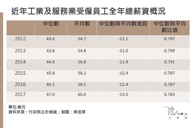 觀察主計總處所公布的資料,自2012~2017年中位數與平均數差距從11.1萬、11.0萬、11.9萬、12.4萬、12.4萬、13.0萬,差距逐步攀升。