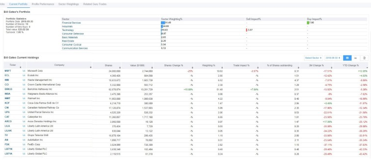 美國財經網站「GURU FOCUS」上公布今年前3季到9月30日為止比爾蓋茲持股的績效,雖然有限制查詢的筆數,但可以從簡單的排序功能看出他的投資組合與投資報酬率。