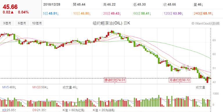 布蘭特原油從10月初的每桶86美元跌到12月底的52美元,以及德州輕甜原油從每桶76.4美元跌到每桶44.6美元,2個月內大跌39%,這意味著什麼?有人要賠大錢了。