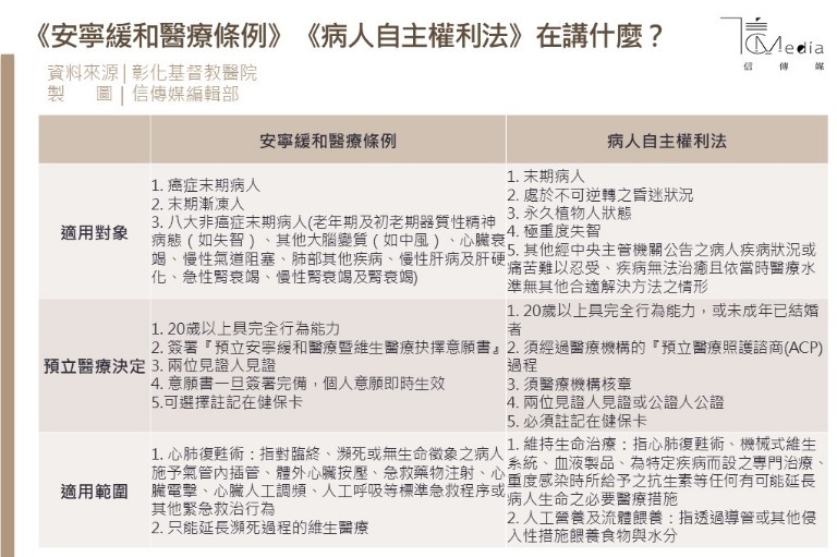 而《病主法》和《安寧緩和醫療條例》不同的地方在於,《病主法》中的預立醫療決定,是病人必須要先簽署的,且內容包含的善終對象和範圍擴大。