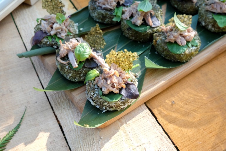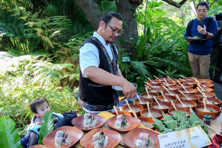 陽光灑落在植物園池塘,熱情伴隨著遠道而來的廚師,在綠蔭圍繞下,來自南投望鄉部落「慢午廚房」的主廚松芳古,專注地舀起事先熬好的樹豆奶油濃湯,用奶油拉花,最後放上一片食茱萸葉,視覺效果滿分。