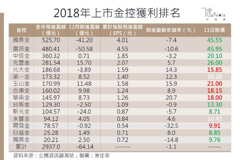整體來看,2018年金控獲利可說是虎頭蛇尾, 15家金控上半年獲利一度達到1877億元,創下歷年同期新高,但第4季以壽險為主體的金控,不敵台美利差持續擴大,造成壽險避險成本提高,加上第4季又有美股、台股「亂流」影響,投資部位無法實現獲利,導致全年整體稅後盈餘為2937億元,年減1.1%,宣告挑戰3000億大關失敗。