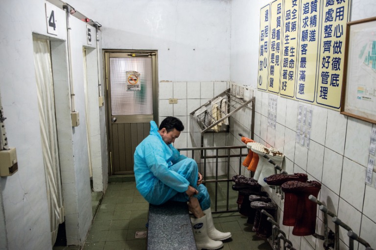 走進福昌豬場,很快就能知道他們克敵致勝的祕密。採訪當天,場外工作人員請我們換上工作服和紅白拖,洗手消毒後進場,再換另一組藍白拖;走到盥洗室,全身沐浴清潔,再換穿場內專用工作服,「頭也要洗喔!」工作人員不忘提醒。最後套上雨鞋,經過消毒走道,前後門關上,自動噴霧消毒30秒後,再洗一次手, 才終於抵達了真正的養豬區域。整個過程換了3雙鞋、手腳消毒3次以上。