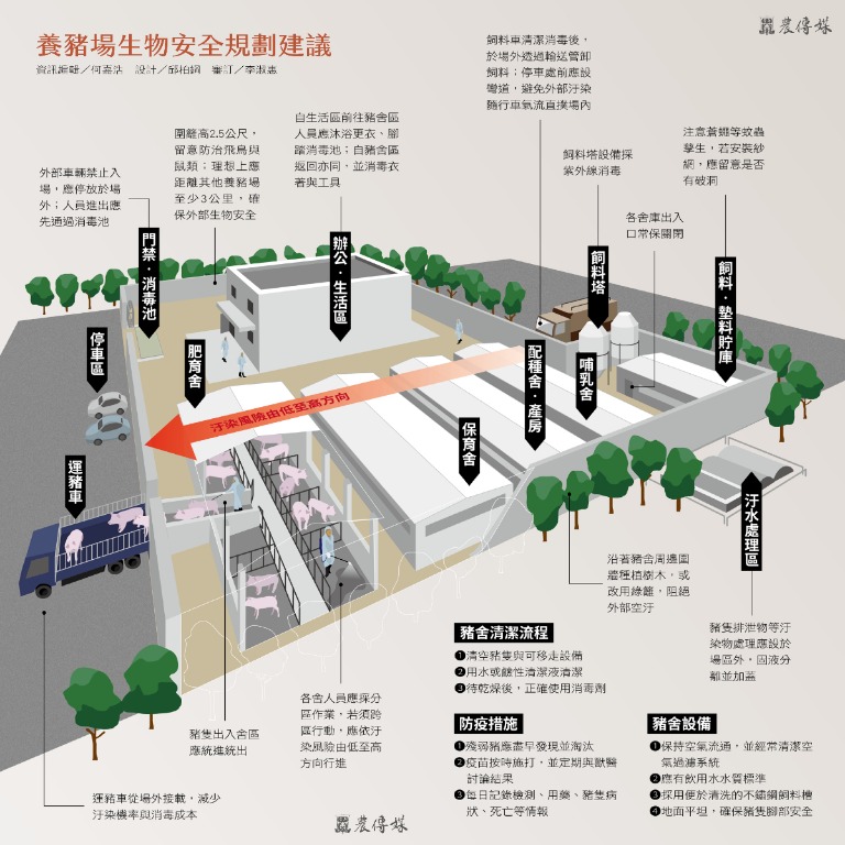阻絕病原,第一道防線是減少不必要的人員、車輛進出,例如將飼料槽設置在畜舍外緊鄰道路的位置,讓飼料車可以直接在馬路上透過輸送管卸料;動物屍體分區隔離,由場內工作人員交給固定化製車處理,切記勿讓化製車開進場內。