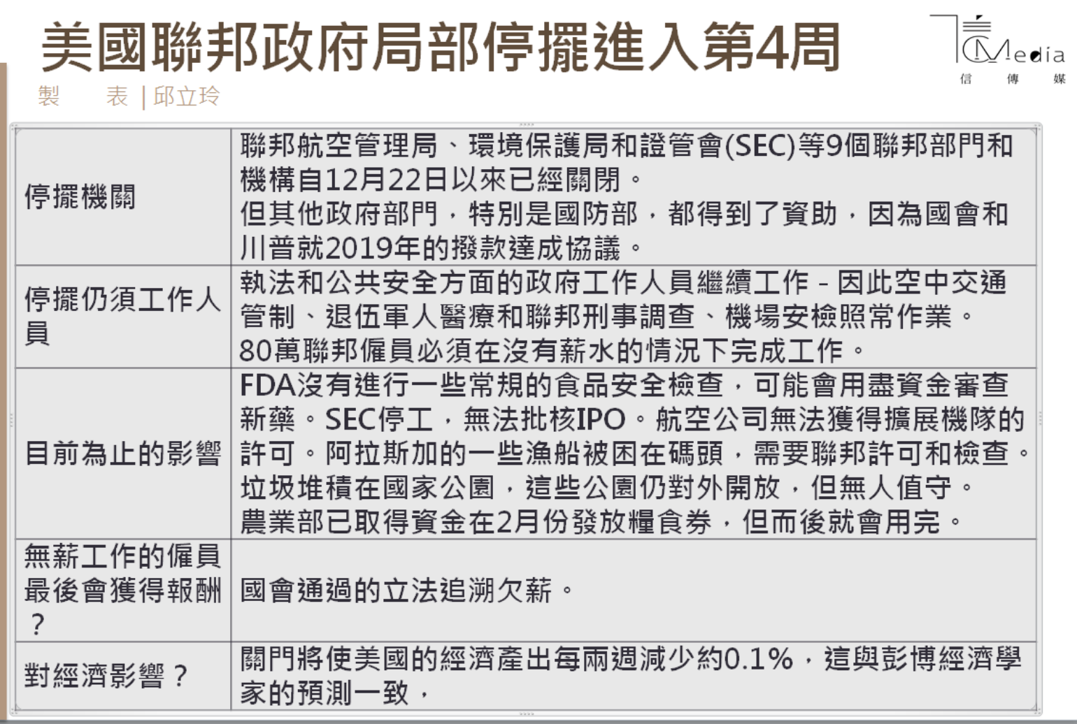 美國政府自12月22日局部關門至今,邁入第4周,而1月17日剛好為第27日停擺,已創下最長關門紀錄,局部停擺已產生廣泛的影響,經濟、機場安檢和民眾等各方面正面臨壓力。