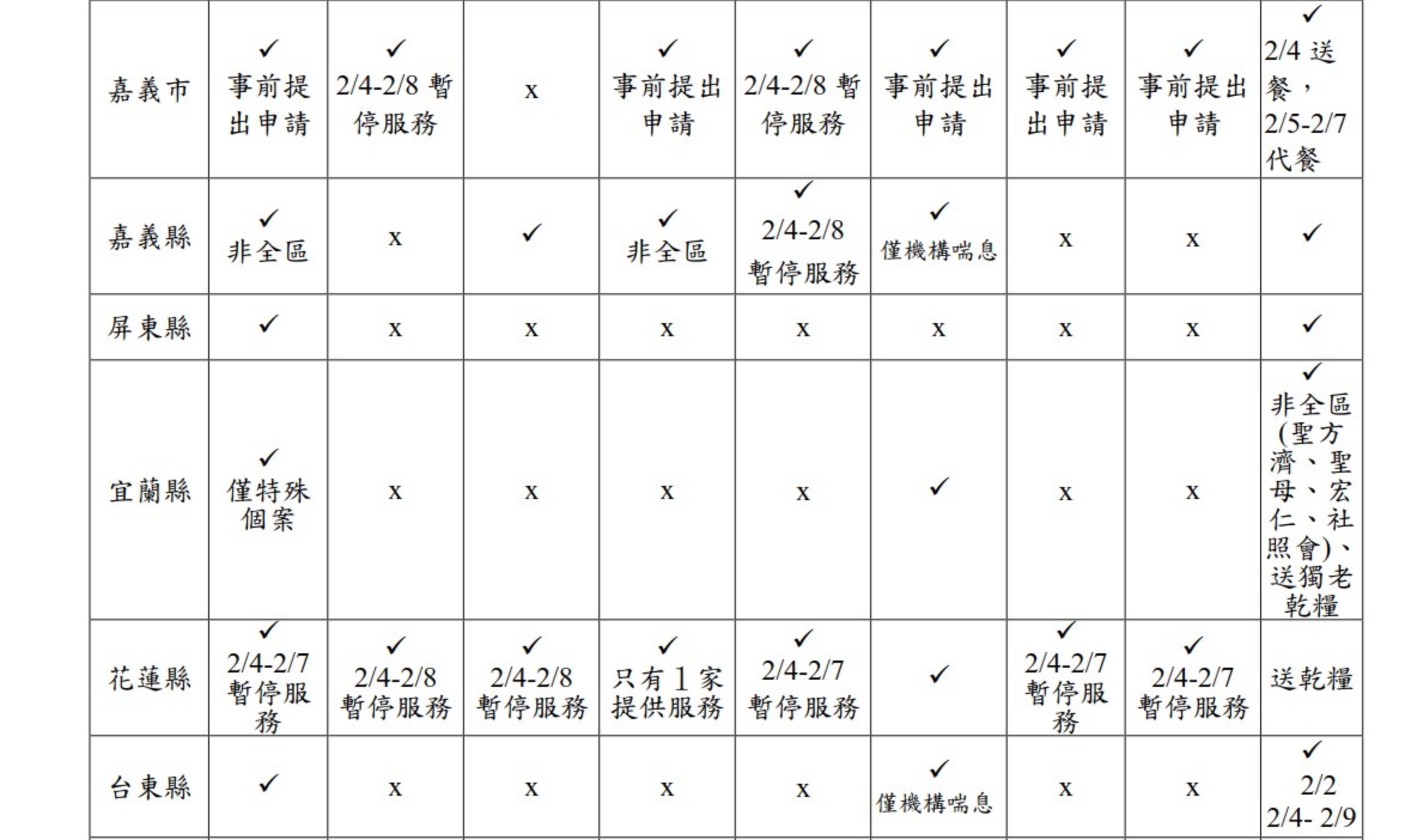 衛福部長照司表示,各縣市春節期間仍持續提供部分長照2.0服務,包括居家照顧服務、日間照顧服務、家庭托顧服務、專業服務、餐飲服務、交通接送服務、喘息服務及餐飲服務等,目前已於22個縣市成立187個照管中心及其分站。
