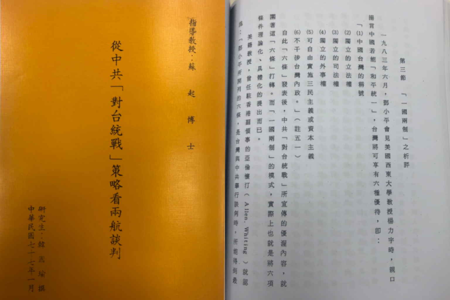 1988年,當時韓國瑜還在就讀政大東亞所,他的碩士論文以《從中共「對台統戰」策略看兩航談判》為題,探討那個時代背景下的兩岸關係。有意思的是,他論文最後的結論是:「一國兩制」是不可能的,也不可行。