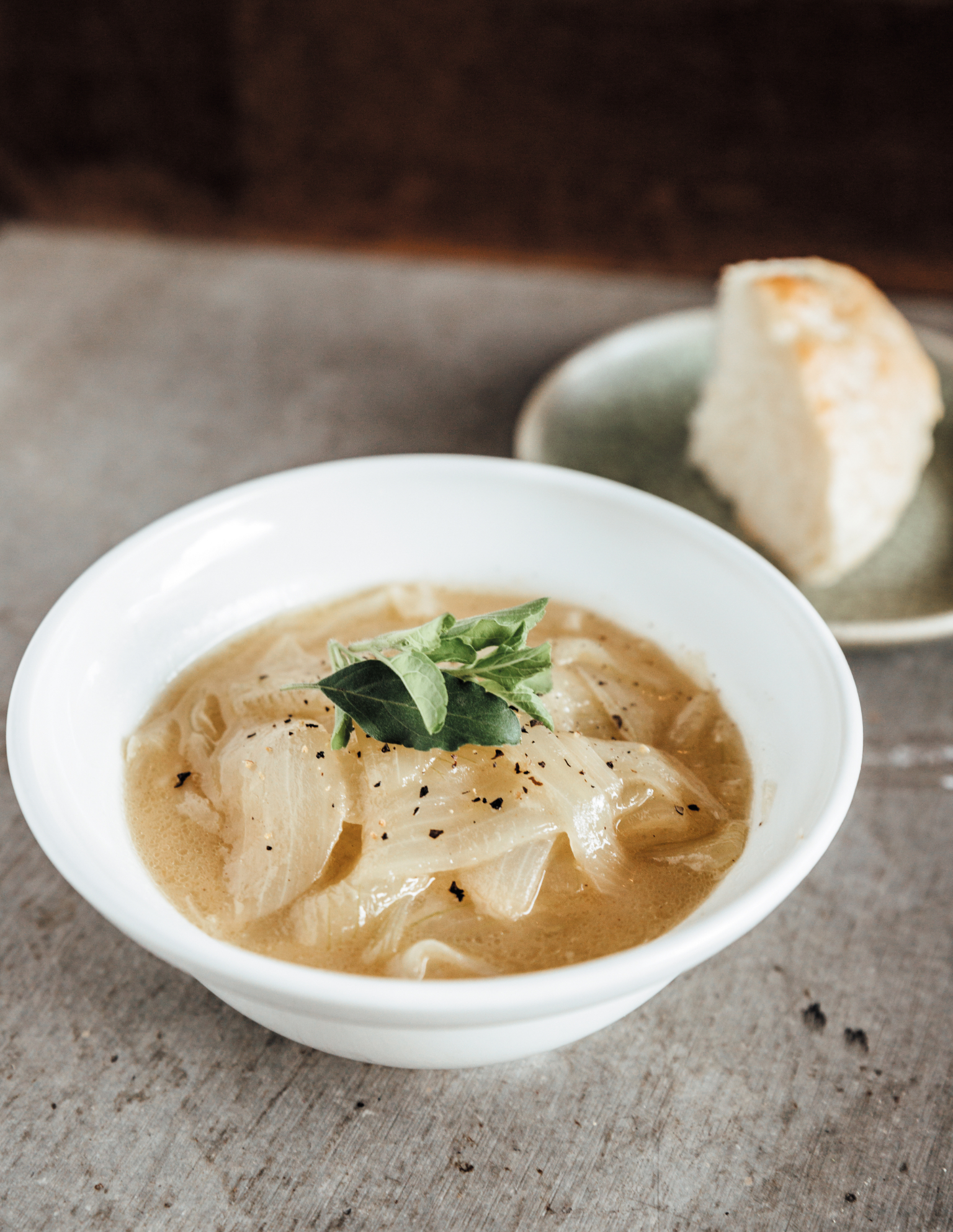 張維新招呼我們來試試洋蔥湯品的味道,搭配店裡自製的麵包。聊起湯,洪輝祥說:「我最喜歡的湯要帶有一點焦味,代表很道地的鄉愁,廚房竄出的湯味就像在呼喚大家吃飯。一般本土的湯會用紅蔥頭去爆香,有了洋蔥後也能用一樣的烹調方式來增加香氣。」他更強調:「餐廳是一個基地,如果站得穩,希望可以開食材的特色餐廳,洋蔥會是一個很好的切入點,因為只要庫存環境好,全年都能有我們的洋蔥。」眼前這樣簡單的一碗湯,承載著洪輝祥與夥伴們滿滿的理念。