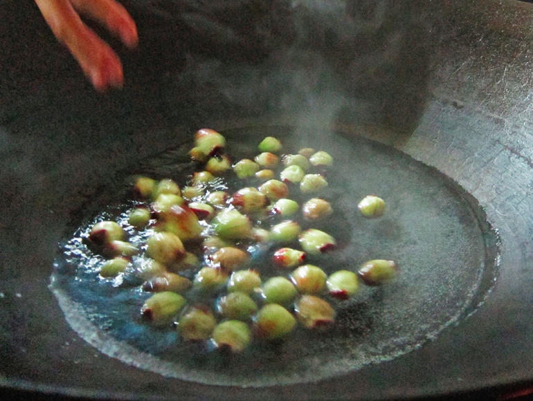 4.糖漬過後的花萼放入鍋中熬煮,適時加入3.的果膠水。