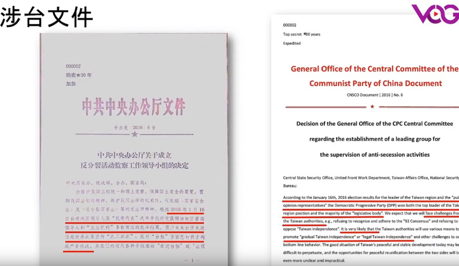 這一份日期是2016年1月19日的機密文件,由栗戰書擔任的中央國安辦主任時由中央辦公廳絕密文件,主要針對3天前1月16日民進黨籍候選人蔡英文贏得總統大選之後的對台監控,內文指出,明確訂定到2017年5月19日前為止為「反分裂活動觀察期」。