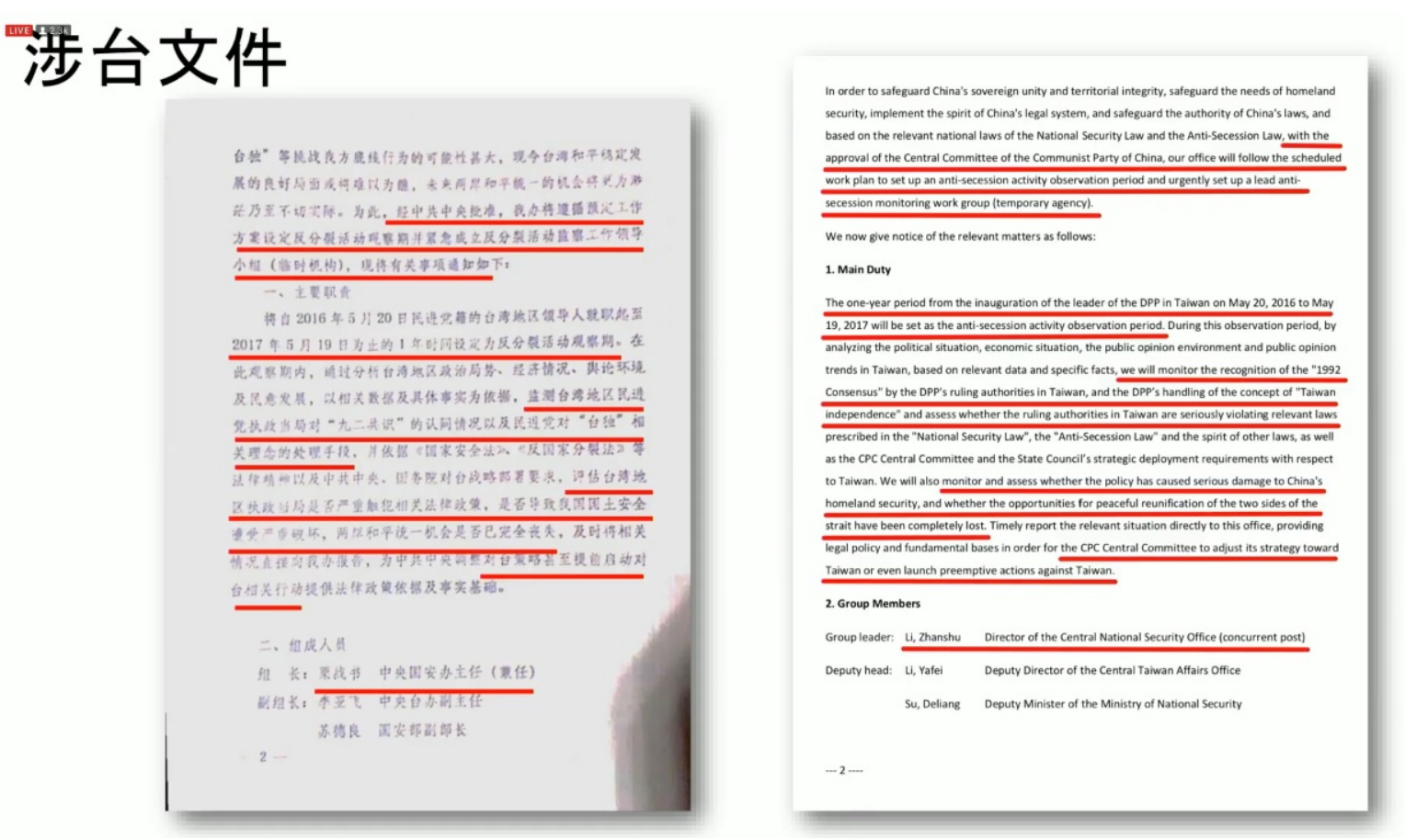 該文件還指出,這個監控小組的目地是「評估台灣地區執政當局嚴重觸犯相關法律政策,是否導致我國國土安全遭受嚴重破壞,兩岸統一機會是否已完全喪失,為中共中央調整對台策略甚至提前啟動對台相關行動提供法律政策依據極事實基礎。」
