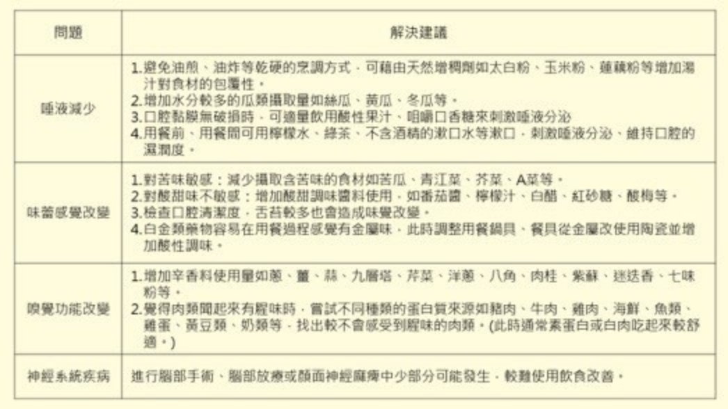 綜合以上味覺的傳遞,若有腦部病變或神經傳導方面的障礙時會影響味覺,因此當味覺發生障礙時,同時也可能影響消化作用。因此,為了維持正常的味覺功增加病患進食的意願並幫助腸胃正常蠕動,接下來就讓我們進一步了解當唾液減少、味蕾感覺改變、嗅覺功能改變、神經系統異常時飲食上該如何調整吧!