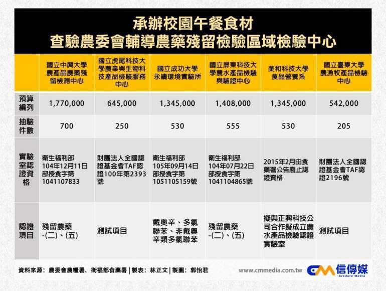 因此在人力編制沒有增加情況下,計畫中檢驗業務幾乎全數委託給農委會輔導的六所農藥殘留檢驗區域檢驗中心(詳見下表),檢驗費用占預算八成。