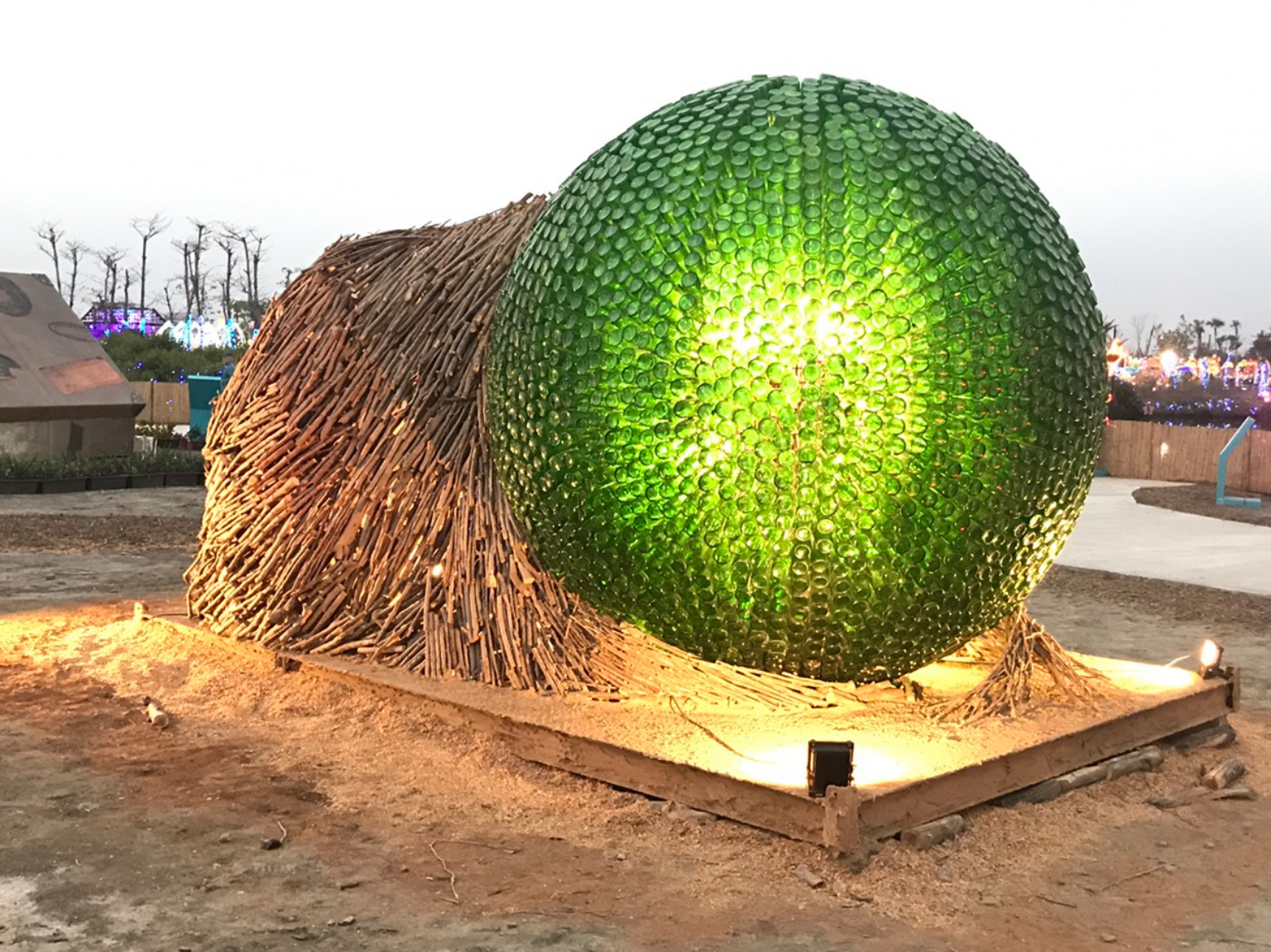 在國際交流區的海之女神,上半身由5噸的鋼材編織做出思忖神情,下半身則由30萬顆牡蠣殼編織成裙擺,高15米的「女神」,搭配上LED呈現光影變化,白天晚上各具特色,讓人驚豔,成為網美必拍燈。