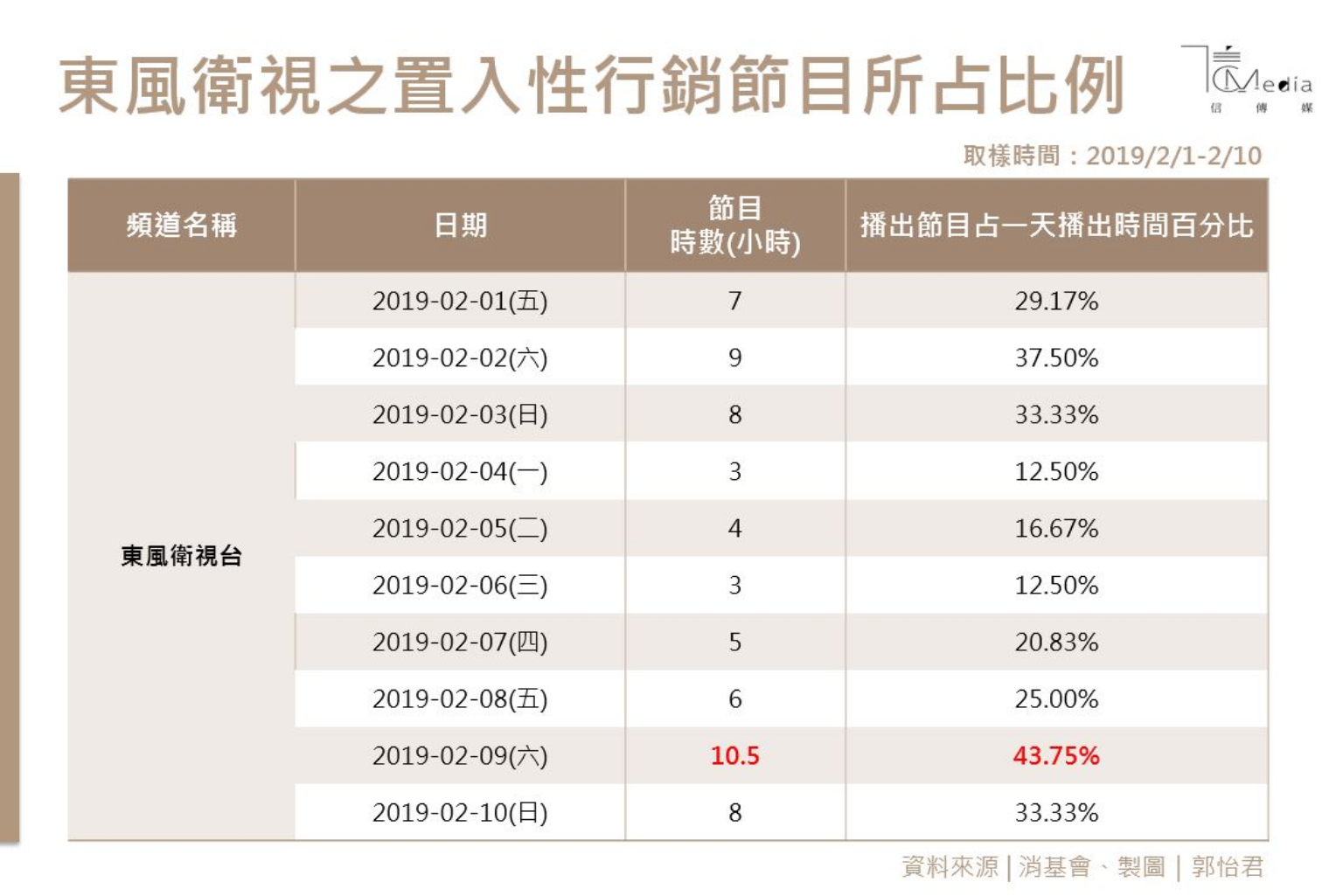 置入性行銷節目究竟有多氾濫呢?根據消基會研究「東風衛視台」、「年代MUCH台」、「JET綜合台」提供的時數為前三多。其中,東風衛視台在同一天播放了高達10.5小時的行銷節目。
