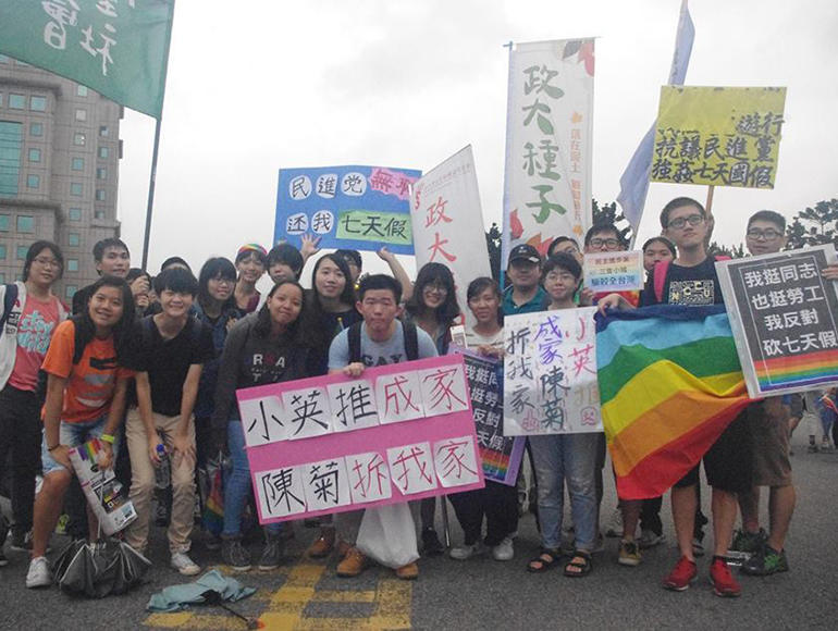 「小英推成家,陳菊拆我家,還我七天假」,在29日同志大遊行的現場,民進黨的隊伍後方跟了一群年輕人,聲嘶力竭地呼喊著口號,走在前頭的民進黨委員臉部表情尷尬極了。