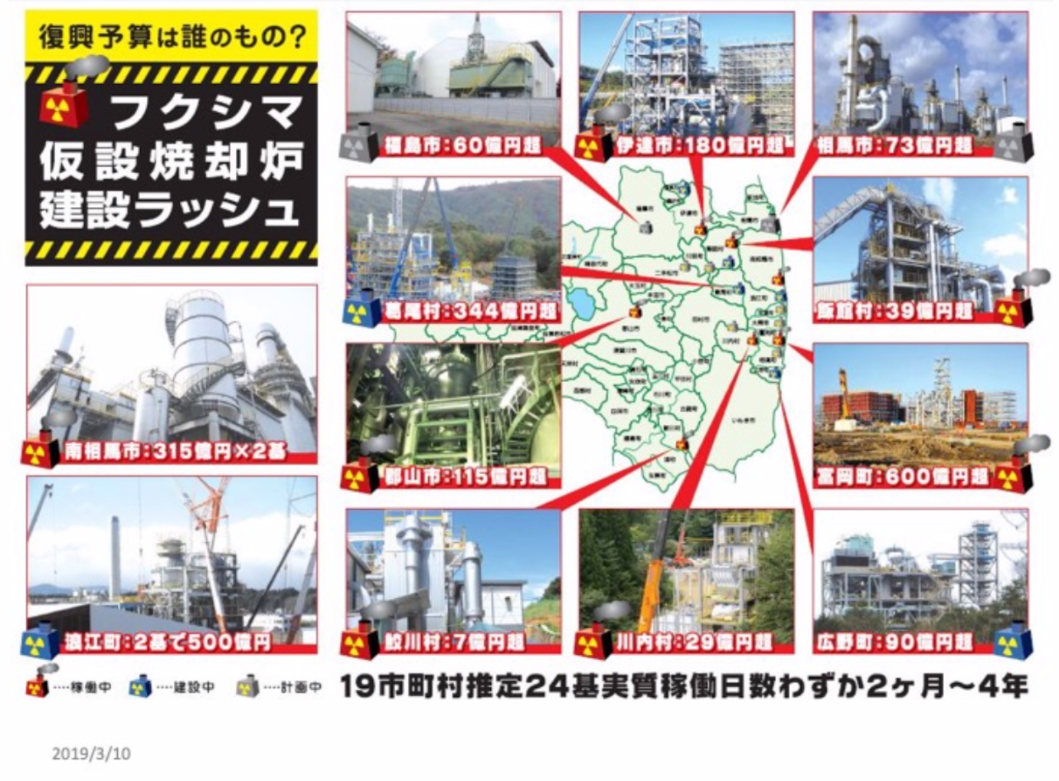 鄰近福島第一核電廠(簡稱F1)的幾個郡、町、市,可以看到不停的工程,大型工程車、貨車在馬路上不停穿梭,大量的工程進行中,工人、被迫返回污染區的民眾都吸了不少充滿銫-137的揚塵,而停業8年的大超市也重新開門做生意了,客人如潮水湧入。