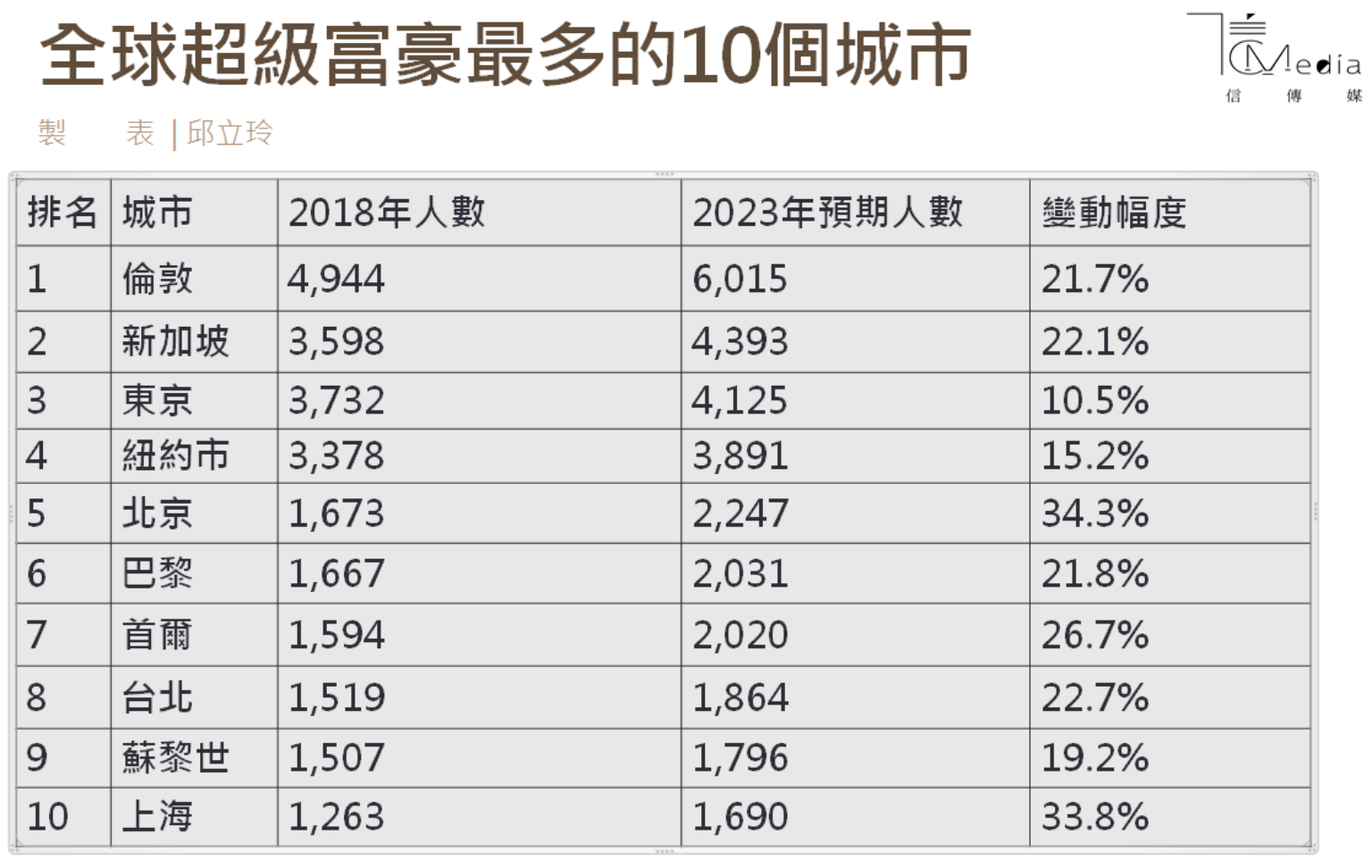 台北的好野人,到底算不算多?其實也可以從這裡看出來。由於台北市人口267.4萬人,不像是東京、北京、上海等動輒人口超過千萬的城市,所以如果從富豪的密度來看,台北應該是僅次於倫敦、新加坡,算是全世界富豪密度第三名的城市。