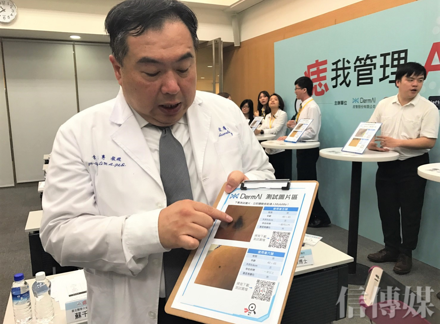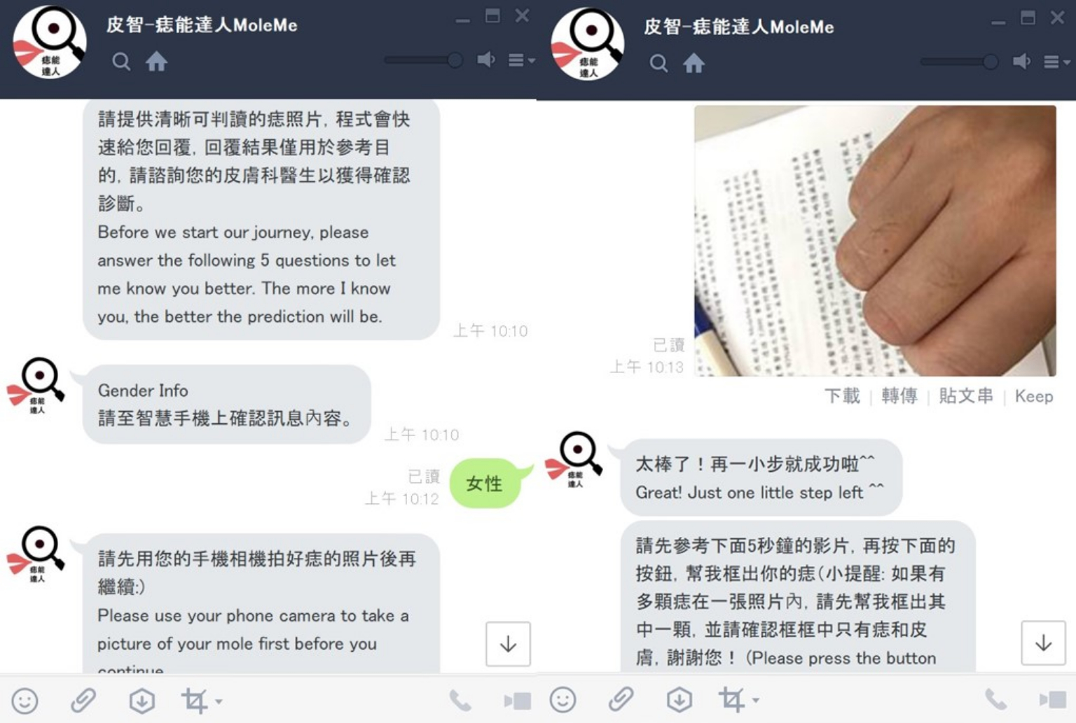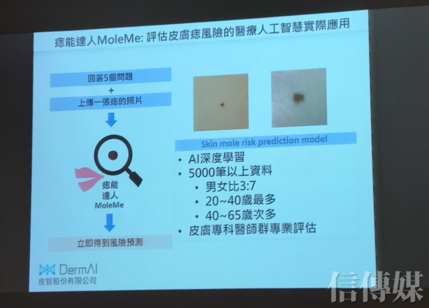 由北醫大育成的「皮智股份有限公司」發表「痣能達人MoleMe」聊天機器人,透過AI建立超過5,000筆醫療影像資料庫,分析痣的異常風險。皮智公司執行長、同時也是皮膚科醫師的靳嚴博表示,「在現實生活中,不太可能把痣一顆一顆去給皮膚科醫師看,醫師在門診也沒有很多時間,現在透過Line就可以初步判斷,而且完全免費。」
