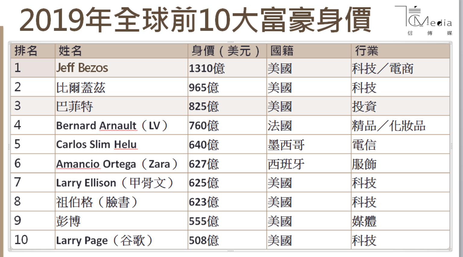 根據《富比士》雜誌,2019年全球富翁冠軍為亞馬遜創辦人貝佐斯,他的身價高達1310億美元,不過,他之前宣布離婚,貝佐斯帝國可能即將面臨重組。