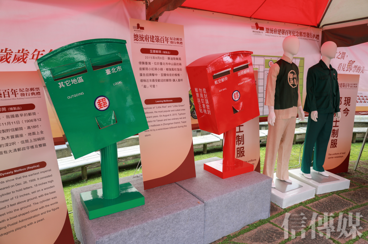 中華郵政展示仿真歪腰郵筒與民初郵務士制服。