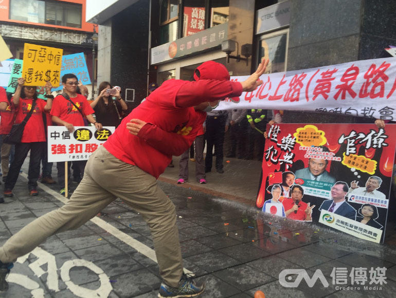 「中信再不負責,下場就會像這個一樣!」樂陞自救會成員氣憤地把手中的水球扔向印有中信實際負責人辜仲諒的看板上,頓時水花四濺。這是14日樂陞自救會北部抗爭大會師的最後一站,位在南京東路上的中信銀行門口,上百名自救會成員聚集抗議,只是抗議者、警察、媒體鬧哄哄一片,中信銀內部卻仍是靜悄悄。