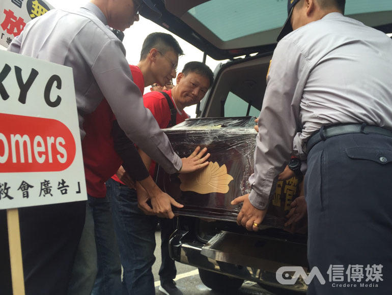 樂陞自救會今早於金管會抬棺抗議,引起騷動。(攝影/陳怡樺)