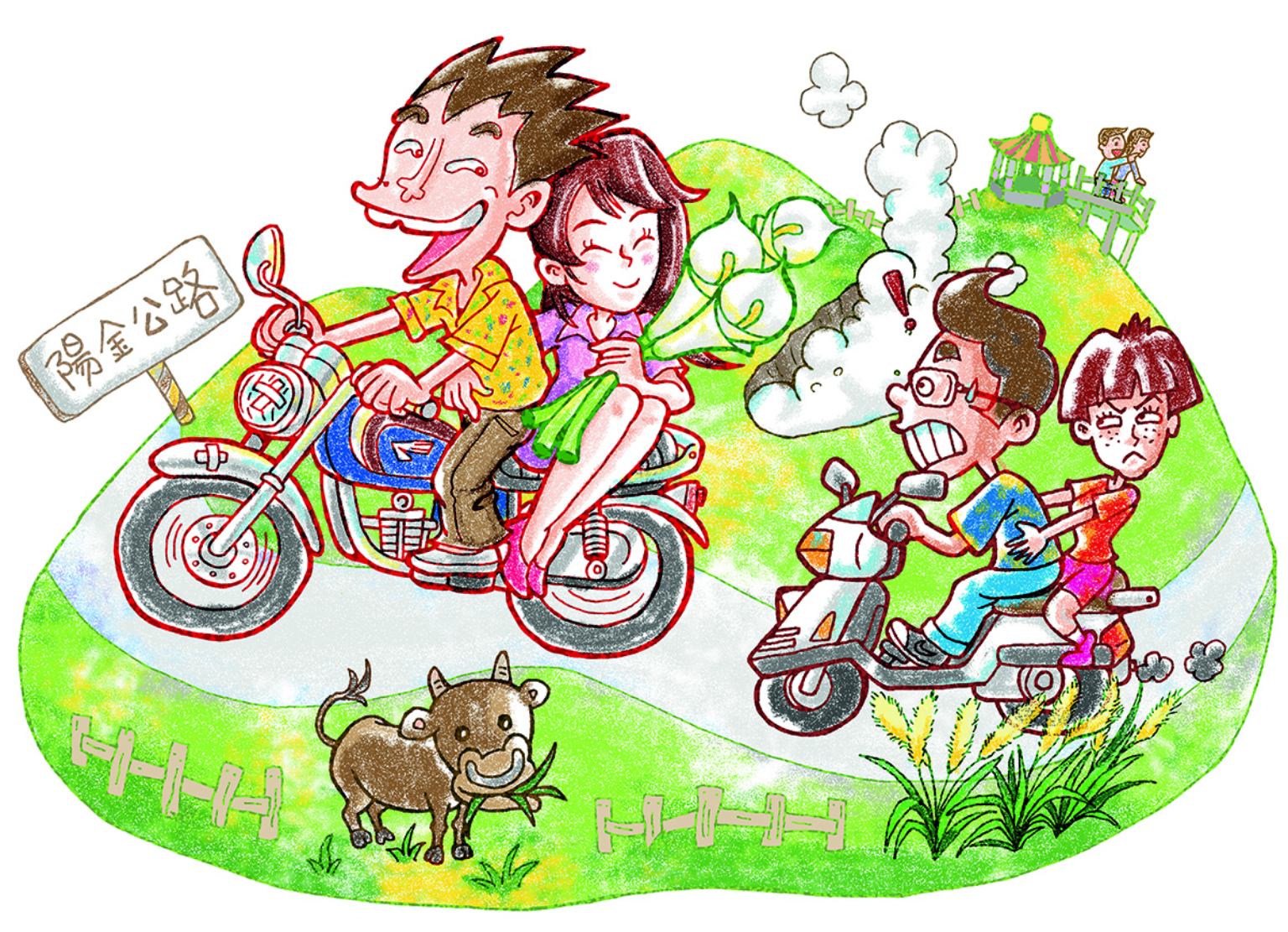 採訪海芋達人當天,竹子湖攝氏8度,海芋季雖然還未開始,花園裡依然可見早鳥蹤影,即使天冷風寒加上點點小雨,苗榜溫室景觀花園餐廳裡因為有一鍋招牌香菇雞湯而暖呼呼。海芋的產業故事直接從野狼125機車切入非常適當。