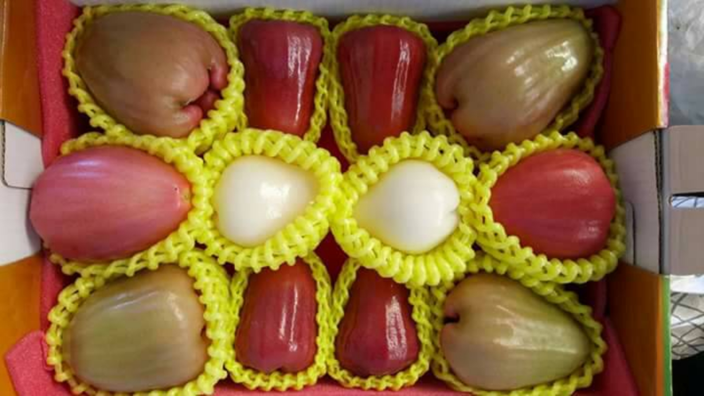 所以拆除套袋看到的只有如羊脂白玉的白蓮霧,其他品系正在開花階段,預計5~6月的產季,最多一次可以品嚐到7種蓮霧的滋味,筆者露出不信的表情,他打開手機秀了一下去年拍攝的禮盒,五顏六色果真是非常特別,多次到屏東採訪蓮霧達人,這還是第一次看見,太神奇了。