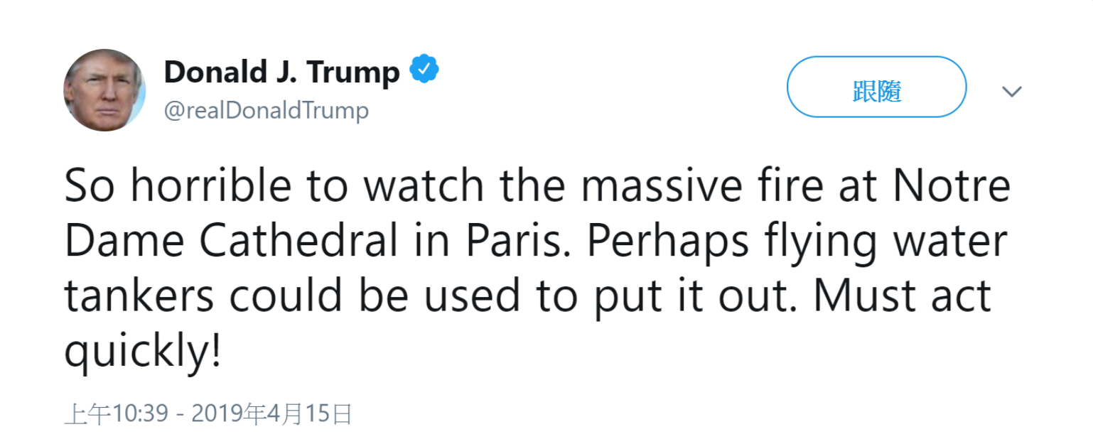 川普說,「眼睜睜看著巴黎聖母院遭逢大火真是太糟了。或許飛機灑水可以撲滅火勢,必須盡快行動!」