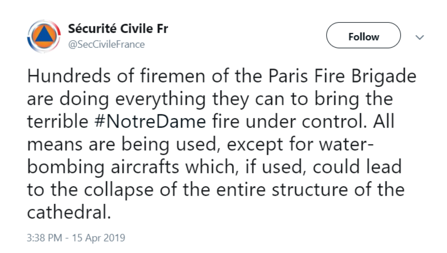 此話引起輿論質疑巴黎消防單位救火不力,導致法國民防組織Sécurité Civile一方面得對抗聖母院大火,一方面還得在網路上滅火。Sécurité Civile在推特上特別用英文解釋,數百名巴黎消防隊員正在盡可能控制火勢,他們已經採取所有措施,「除了用飛機灌水以外,因為這可能會造成教堂結構坍塌。」