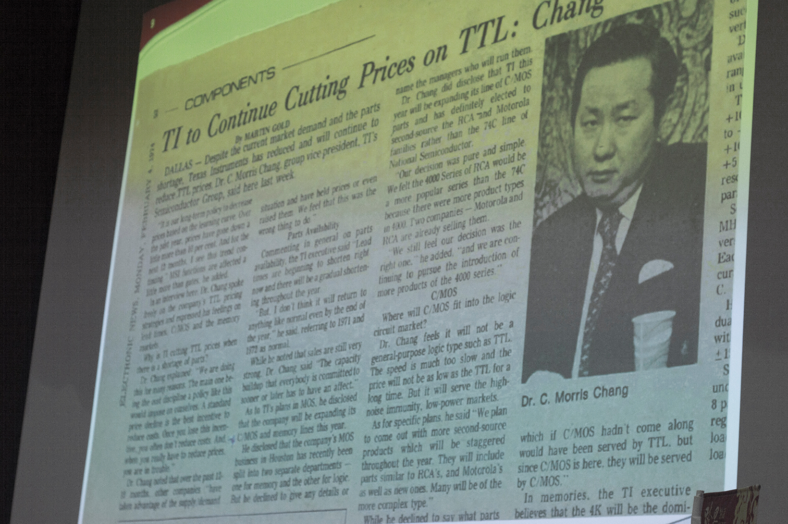 在演講的最後,張忠謀也拿出1974年他在德州儀器擔任副總裁、接受媒體專訪的陳年舊照,張忠謀輕鬆表示,當時他在採訪時提到缺貨「那時我學策略還不久,這只是我的牛刀初試。」不過話鋒一轉他也隨即談到,在德州儀器學到的東西,到台積電全都用上了,「這是T.I(德州儀器)的悲哀」。