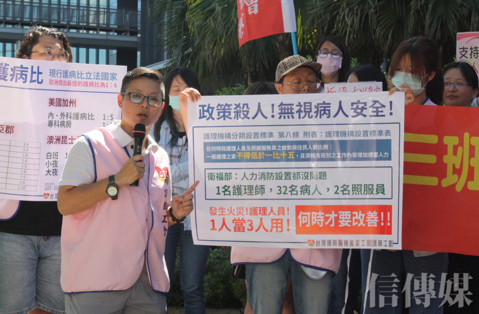「沒有,還是一樣全日護病比啊!」陳玉鳳指出,現行醫學中心的護病比是1:9、區域是1:12、地區是1:15,「可是對我們來講還是太高,上次雖然跟衛福部陳情、他們也說會改善,但還是用全日的平均比數,而且是用常數計算不是用人去計算,這樣跟國際比還是比不上、而且是倒退。我們的政府怎麼都是在幫財團法人在服務的?」
